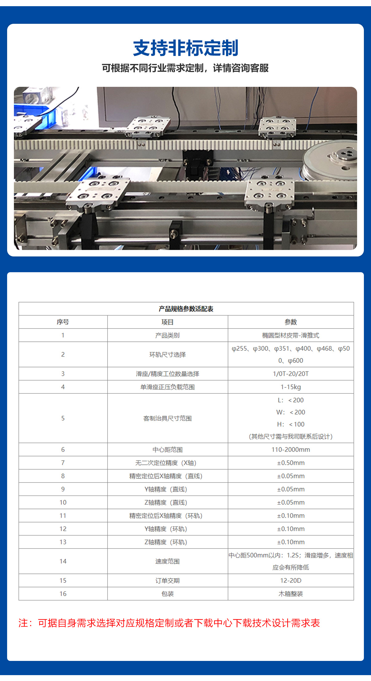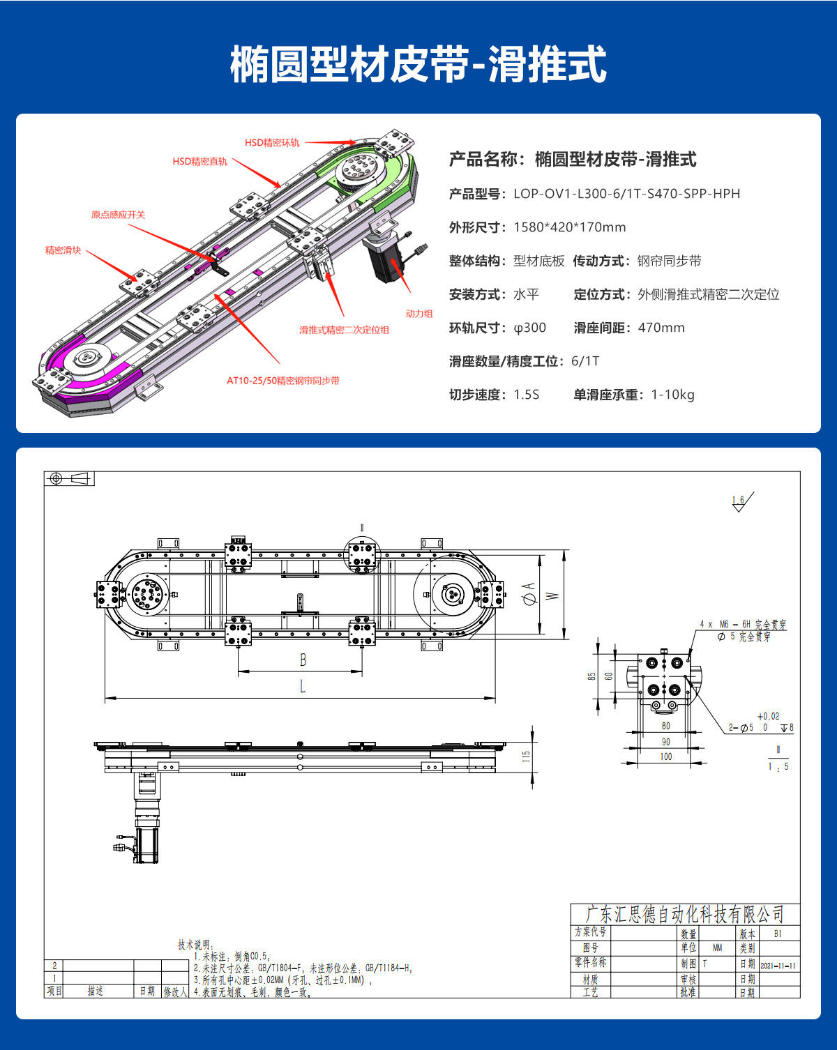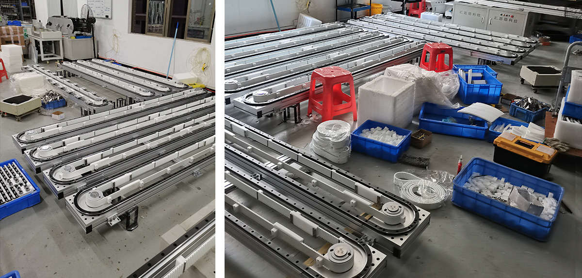 橢圓皮帶-型材滑推項(xiàng)目線體,本項(xiàng)目采用HSD自研自產(chǎn)的V型軌道及配套GMP系列產(chǎn)品,項(xiàng)目精度高,運(yùn)行速度快,噪音低;項(xiàng)目采用型材和底板作為安裝基準(zhǔn),線體總長度可以10米以上,在連接塊的作用下,安裝便捷快速,周邊配套機(jī)構(gòu)方便安裝延伸。匯思德采用的同步皮帶為AT10鋼簾皮帶,帶寬有25mm、50mm,其中線體超過8米時,建議使用50mm寬的同步皮帶,載重較大時,還需選用加厚型的同步皮帶,目前有仿形齒連接方式和皮帶扣連接方式,鋼簾皮帶抗拉能力強(qiáng),不易扯斷,同步性好,精度高。可在直線任意工位和環(huán)軌位置設(shè)計(jì)二次定位機(jī)構(gòu),使項(xiàng)目線體的重復(fù)定位精度小于±0.05mm,此項(xiàng)目二次定位機(jī)構(gòu)為滑推式定位機(jī)構(gòu),可選用在線體的內(nèi)側(cè)或者外側(cè)進(jìn)行安裝。項(xiàng)目采用伺服電機(jī),斜齒行星減速機(jī),控制便利,扭力輸出穩(wěn)定可靠。此線體適用于工位較多,工藝復(fù)雜的項(xiàng)目當(dāng)中。